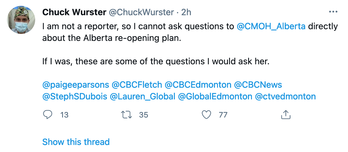 Here in Alberta this year, it has become even more pronounced. Here are a few examples from Tweets I saw last week just after Premier Kenney announced that Alberta is only a few weeks away from opening up this summer. These questions mentioned the Chief Medical Officer of Health, Dr. Deena Hinshaw specifically.