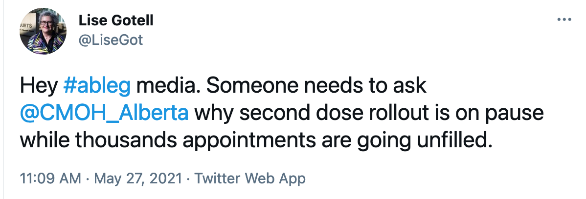 This produced more anger and more questions. For over a year we’ve been told we’re not safe until two weeks after we get our second vaccination. Now it appears Kenney, supported by Hinshaw, are quite happy with 60-70% of people getting their first dose. The goalposts have been moved. Again.
