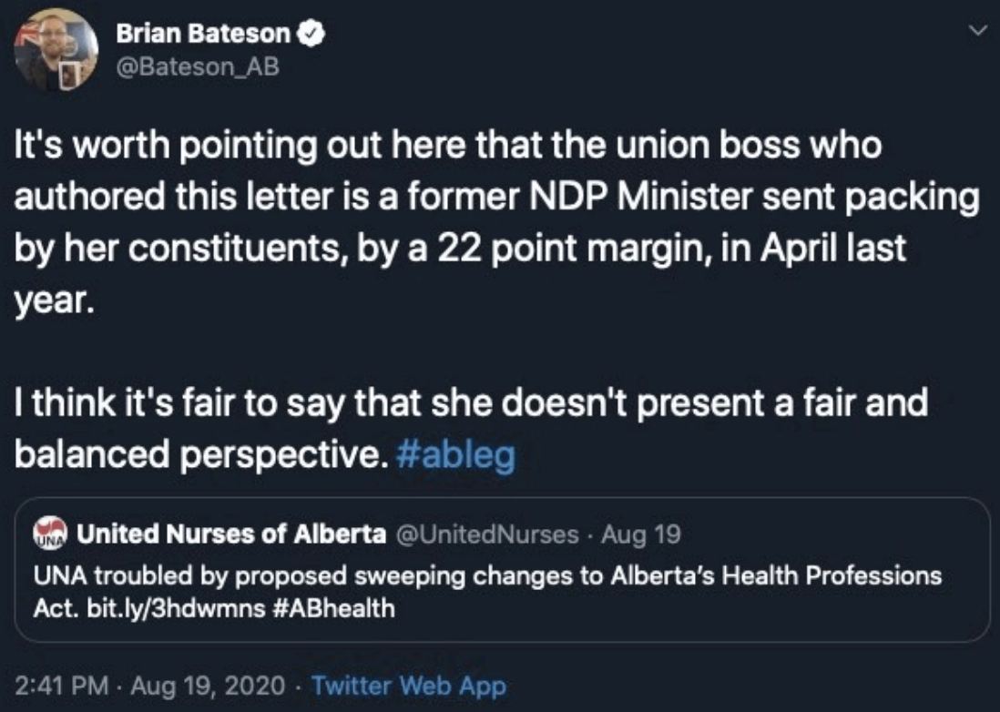 Just last week, a senior staff member in the Premier’s office enraged the United Nurses of Alberta (wrong union to mess with) when he sent this Tweet about the union’s First Vice President Danielle Larivee, a former NDP cabinet minister.