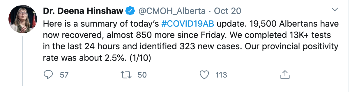 It’s now clear that Dr. Hinshaw’s Twitter feed is trying to play down daily case count numbers and focus on other aspects of the virus. As a former member of the news media for many years and somebody who studies the way issues are managed, this is a clear attempt by AHS to try to control the message, as COVID numbers in Alberta go through the roof.
