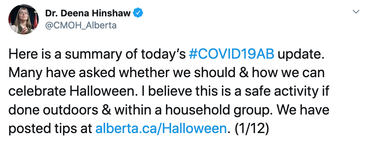 I think you’ll agree, all those numbers are more important than once again telling Albertans it’s okay for their kids to go trick or treating.